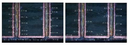 面銅控制中值在35um,則實(shí)際完成銅厚在30到40um之間,根據(jù)客戶的電阻要求,計(jì)算線寬公差范圍如下表2,根據(jù)下表計(jì)算結(jié)果,控制銅厚理論優(yōu)區(qū)間32到40um之間。