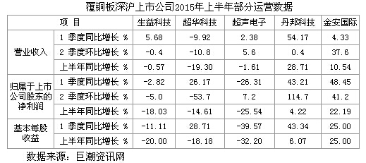 我覆銅板制造企業(yè)或包含有覆銅板制造的企業(yè),在深滬上市的共有5家公司。根據(jù)這些公司公布的業(yè)績報告,整理計算的各公司營業(yè)收入、歸屬于上市公司股東的凈利潤和基本每股收益3項指標的增長情況,如下表。