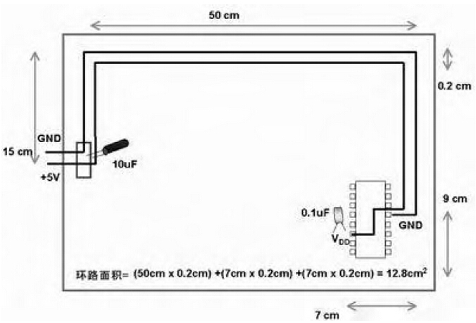 上圖的電源地回路面積大,容易受電磁干擾。
