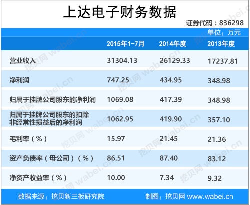 上達電子成立于2004年11月19日。公告顯示,上達電子2013年度、2014年度、2015年1-7月營業收入分別為1.72億元、2.61億元、3.13億元;凈利潤分別為348.98萬元、434.95萬元、747.25萬元。如下圖所示: