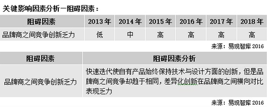 阻礙智能手機(jī)市場發(fā)展的因素其中之一是智能手機(jī)市場本身產(chǎn)品已缺乏新意,目前為了應(yīng)對市場競爭,各家廠商的產(chǎn)品更新周期都在縮短,快速迭代雖然在同一品牌內(nèi)能帶來技術(shù)提升,但是品牌之間橫向比較很難見到差異化創(chuàng)新,導(dǎo)致硬件產(chǎn)品之間競爭趨同。