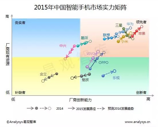目前智能手機(jī)已進(jìn)入到產(chǎn)業(yè)發(fā)展的成熟期,市場品牌格局相對穩(wěn)定,2015年整體智能手機(jī)市場超過80%的是產(chǎn)手機(jī),2015年智能手機(jī)市場雖然銷量仍保持增長,但是增速明顯下降。