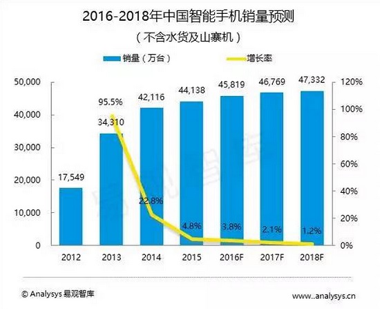 根據(jù)Analysy易觀智庫數(shù)據(jù)顯示,預(yù)計(jì)2016年中智能手機(jī)銷量將達(dá)到4.41億,較2015年增長3.8%。預(yù)計(jì)2018年中智能手機(jī)銷量將在4.73億左右,整體增長速率呈現(xiàn)出下降趨勢。
