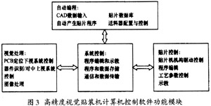 3)軟件功能高精度視覺貼片機軟件系統一般為二級計算機控制系統,采用 DOS或Windows界面,也有采用UNIX操作系統的。主要由系統控制軟件、自動編程軟件、貼片控制軟件和視覺處理軟件等幾部分組成。其主要組成功能模塊如圖3所示。